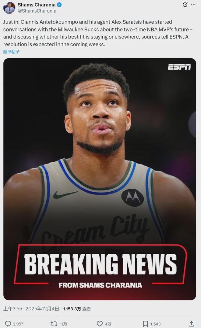各位篮友,不信篮君,难道还不信Shams吗?Shams敢这么报道,说明字母哥离队已经是很大概率的事件。