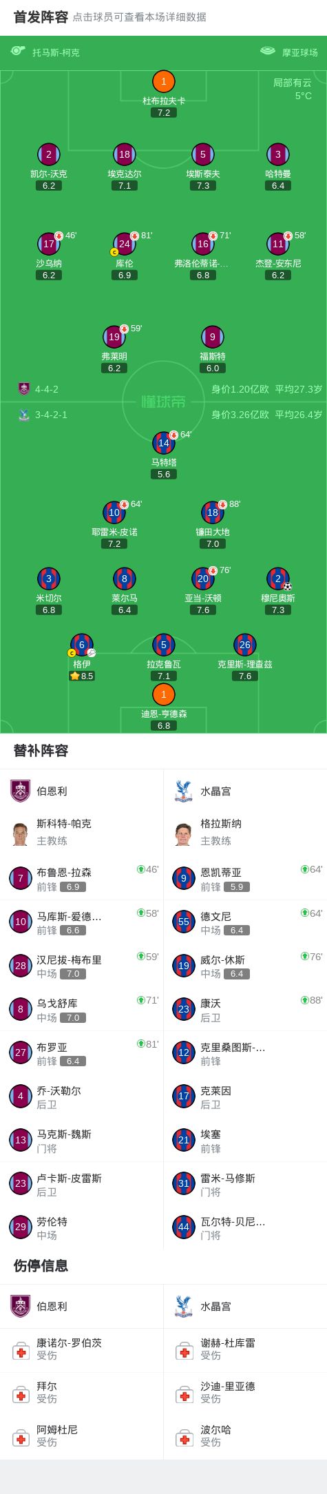 第44分钟,打破僵局,穆尼奥斯后点包抄头球破门,水晶宫1-0